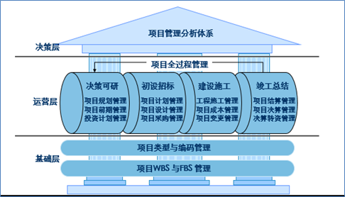 ? ? ? 2、運營層:以項目管理全過程為主線,梳理優(yōu)化項目決策可研、初設(shè)招標(biāo)、建設(shè)施工、竣工結(jié)算等各階段業(yè)務(wù)流程,明晰跨部門的職責(zé)和接口/協(xié)同關(guān)系。針對項目多計劃管理、項目物資/服務(wù)采購管理,項目質(zhì)量管理,項目成本管理等專項管理領(lǐng)域提出優(yōu)化方案,并建立項目后評估機制,實現(xiàn)項目全方位的分析評估。