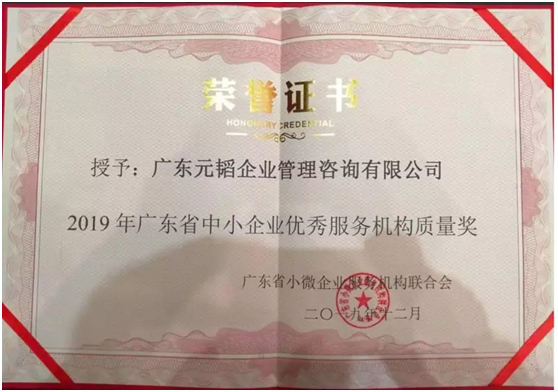 熱烈祝賀廣東元韜企業(yè)管理咨詢有限公司榮獲“2019年廣東省中小企業(yè)優(yōu)秀服務(wù)機(jī)構(gòu)質(zhì)量獎(jiǎng)”