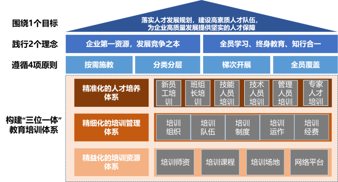 圍繞“落實人才發(fā)展規(guī)劃,建設(shè)高素質(zhì)人才隊伍,為企業(yè)高質(zhì)量發(fā)展提供堅實的人才保障”一個目標,踐行“企業(yè)第一資源,發(fā)展競爭之本”的人才理念和“全員學習、終身教育、知行合一”的教育培訓理念兩個理念,遵循“按需施教、分類分層、梯次開展、全員覆蓋”四項原則,構(gòu)建精準化的人才培養(yǎng)體系、精細化的培訓管理體系、精益化的培訓資源體系“三位一體”教育培訓體系,不斷提升教育培訓效能。