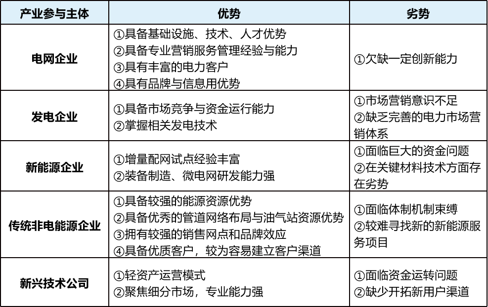 新能源綜合服務(wù)平臺(tái)市場(chǎng)前景廣闊,傳統(tǒng)能源企業(yè)與新型能源企業(yè)均在積極進(jìn)行資源整合尋求機(jī)會(huì),綜合能源服務(wù)產(chǎn)業(yè)呈現(xiàn)多主體激烈競(jìng)爭(zhēng)的市場(chǎng)態(tài)勢(shì)。當(dāng)前,構(gòu)建新能源綜合服務(wù)平臺(tái)的參與方主要有五類:電網(wǎng)企業(yè)、發(fā)電企業(yè)、新能源企業(yè)、傳統(tǒng)非電能源企業(yè)、新興技術(shù)公司,通過對(duì)五類不同參與主體的對(duì)比分析,可以幫助電網(wǎng)企業(yè)了解競(jìng)爭(zhēng)對(duì)手情況,為后續(xù)電網(wǎng)企業(yè)開展綜合能源服務(wù)打下堅(jiān)實(shí)基礎(chǔ)。