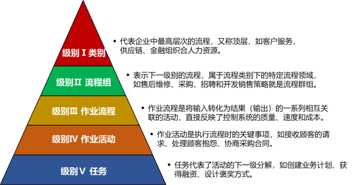 企業(yè)可以參照PCF對比自身在流程管理方面存在哪些缺失以供后續(xù)改進,或以此為參照新建或重構(gòu)流程,也可對組織之間的績效進行客觀的比較。PCF共有5個層級,分別為類別、流程組、作業(yè)流程、作業(yè)活動、任務(wù)。
