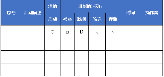 ASME 標準,即美國機械工程師學會(American Society of Mechanical Engineers)標準。此方法在對流程進行標準化分析時,以畫表格的方式,將流程中的過程活動細分為增值活動、非增值活動、檢查、耽擱、輸送、存儲 6種類型,并通過 6 種符號在表格中進行形象的展現(xiàn)。ASME方法能清晰而準確的反映業(yè)務(wù)流程中的各環(huán)節(jié)是否可以給企業(yè)和客戶帶來增值效益,其中增值活動和非增值活動判斷的標準是根據(jù)能否給整個流程帶來正增值或者給客戶帶來價值的增加而確定,企業(yè)在進行流程再造時可以針對性的提出對非增值的流程活動的優(yōu)化和整合方案。