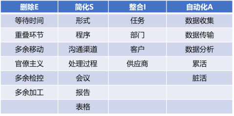 ESEIA 是英文單詞 Eliminate、Simplify、Establish、Integrate、Automate 的首字母組合,即消除、簡化、填補、整合、自動化。在進行流程優(yōu)化時,它要求對流程中導致增值活動效率低的某些帶有缺陷性的增值部分進行填充,以便優(yōu)化后的流程可以運行得更通暢,獲取更好的結(jié)果。
