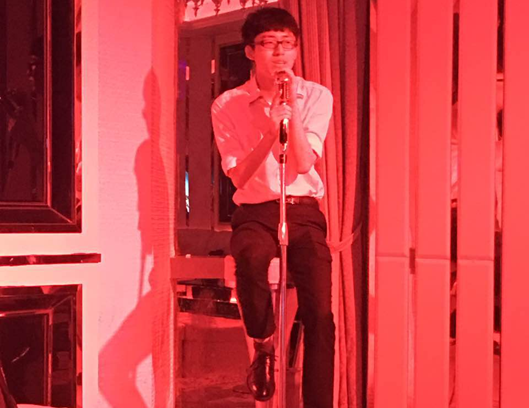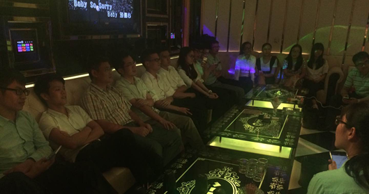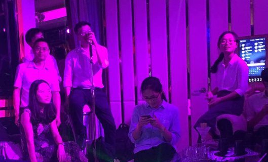 ? ? ? 吃飯與唱歌似乎從來就是集體活動的標(biāo)配,但這并不妨礙我們把標(biāo)配變成絕配。在主持人的精心策劃下,采用抽簽的方式,保證每位同事都獲得至少一次的演唱機(jī)會。五音不全也好,字正腔圓也好,唱的是氣氛,是開心。氣氛瞬間從拘謹(jǐn)切換到熱烈,曲調(diào)也從柔和溫婉轉(zhuǎn)變?yōu)闊崆楦呖?,歌聲成了最好的交流語言。中文、粵語、閩南語、英語匯聚在一起,歡樂匯聚在一起,大家匯聚在一起……