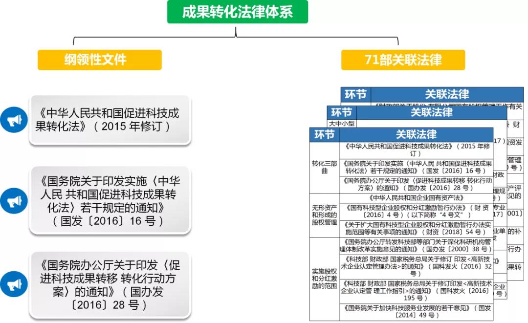 首先,介紹了科技成果轉(zhuǎn)化的起源——《中華人民共和國(guó)促進(jìn)科技成果轉(zhuǎn)化法》(2015 年修訂),該法詳細(xì)闡述了“科技成果”定義,審批權(quán)限的下放,轉(zhuǎn)化方式、定價(jià)機(jī)制、獎(jiǎng)勵(lì)、離崗等成果轉(zhuǎn)化環(huán)節(jié)。然后,延伸至兩份綱領(lǐng)性文件和71部關(guān)聯(lián)法律。這些共同構(gòu)成整個(gè)成果轉(zhuǎn)化法律體系。