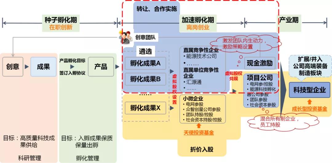 前面講述了成果轉(zhuǎn)化的通用做法,接下來(lái)介紹元韜項(xiàng)目組在某省級(jí)電網(wǎng)公司的科技成果孵化基地服務(wù)經(jīng)驗(yàn),向我們展示了該公司科技成果轉(zhuǎn)化的三個(gè)階段:種子孵化期、加速孵化期以及產(chǎn)業(yè)期的具體步驟以及常見(jiàn)問(wèn)題。