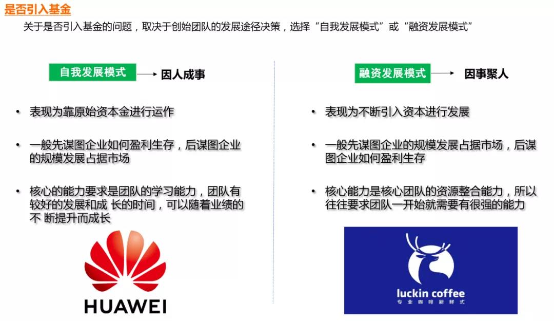 像是在關(guān)于是否引入基金的問(wèn)題上,以華為和瑞幸咖啡為例,深度講解了自我發(fā)展模式(因人成事)和融資發(fā)展模式“因事聚人”的特點(diǎn)及可能的風(fēng)險(xiǎn)點(diǎn)。
